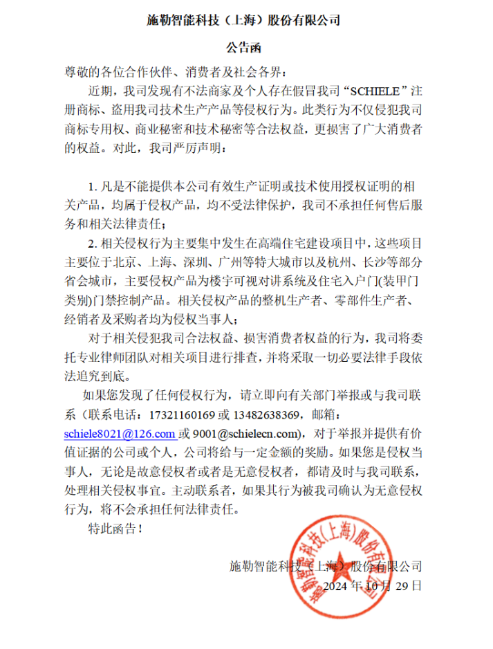 施勒智能科技(上海)股分無限公司通知布告函